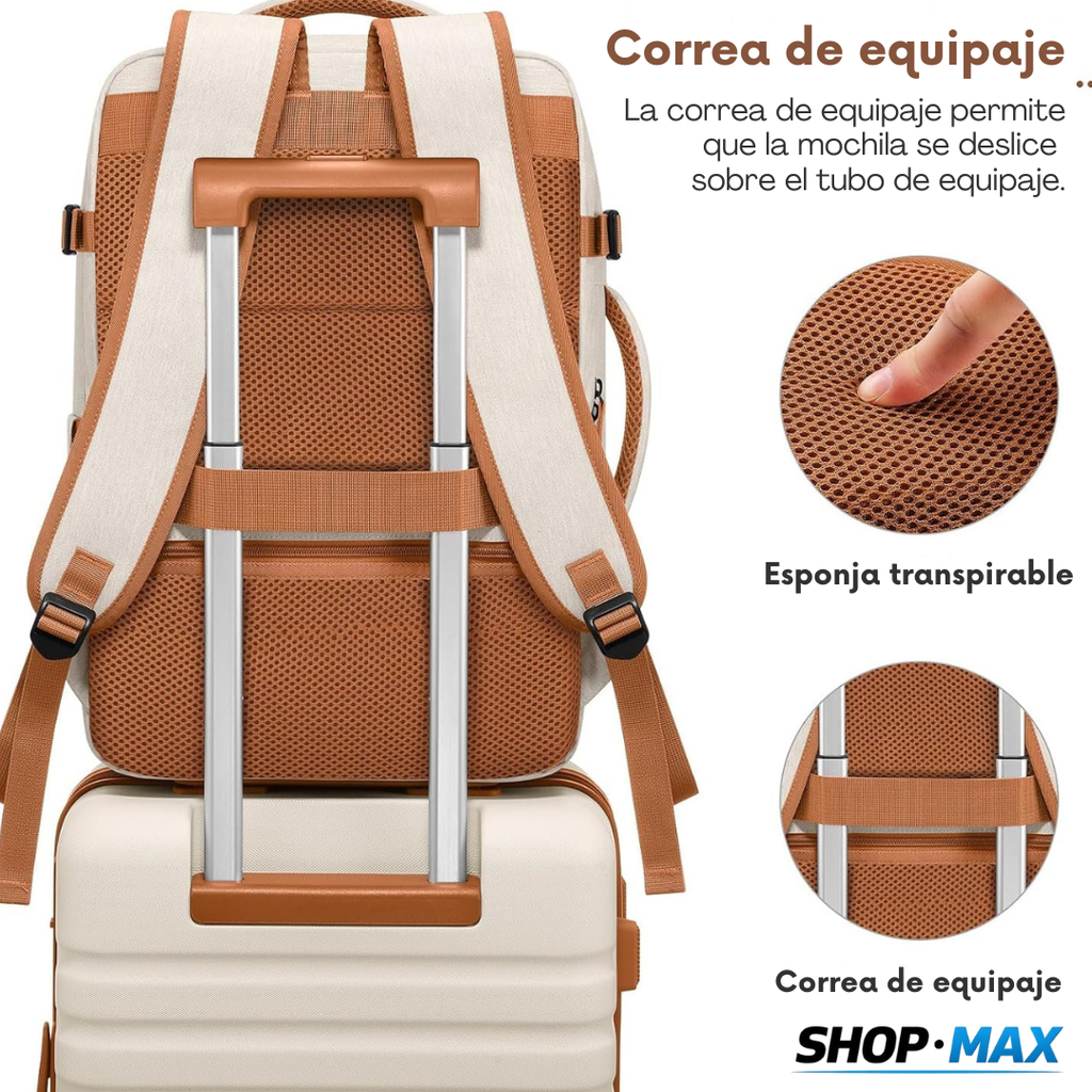 La maleta de cabina está diseñada para caber en los compartimentos superiores o debajo del asiento. La mochila cuenta con una banda trasera que se adapta al asa retráctil de la maleta, facilitando el desplazamiento en aeropuertos y traslados urbanos