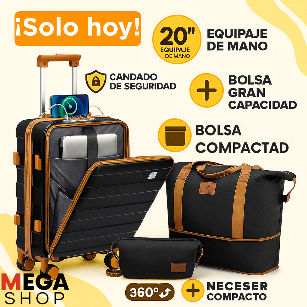 Viajá con estilo y practicidad con el Kit de Viaje IMIOMO 3 en 1, que incluye una valija de cabina rígida de 20” aprobada como equipaje de mano, una bolsa de lona de gran capacidad y un neceser compacto. Cada pieza fue diseñada para ofrecer comodidad, seguridad y organización en tus viajes: la valija cuenta con ruedas 360° silenciosas, manija telescópica ajustable y cierre con traba de seguridad; la bolsa es resistente, liviana y espaciosa; y el neceser mantiene tus artículos de higiene y accesorios siempre ordenados.